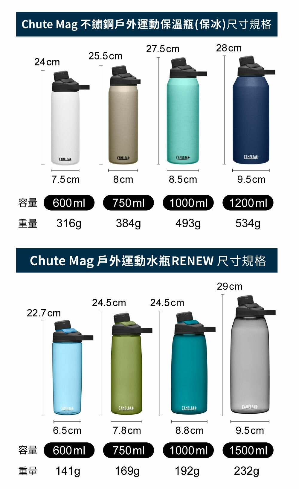 無論何時何地,CamelBak CHUTE® MAG戶外運動水瓶系列提供您快速便利的飲水。不同於市場上單純的水瓶,CHUTE® MAG戶外運動水瓶改良飲水口的設計,內螺紋方便不卡垢,全新設計的磁力瓶嘴蓋可吸附於側邊,讓您暢快飲用,一體成型的兩指寬熱塑提把設計,方便您隨時攜帶。