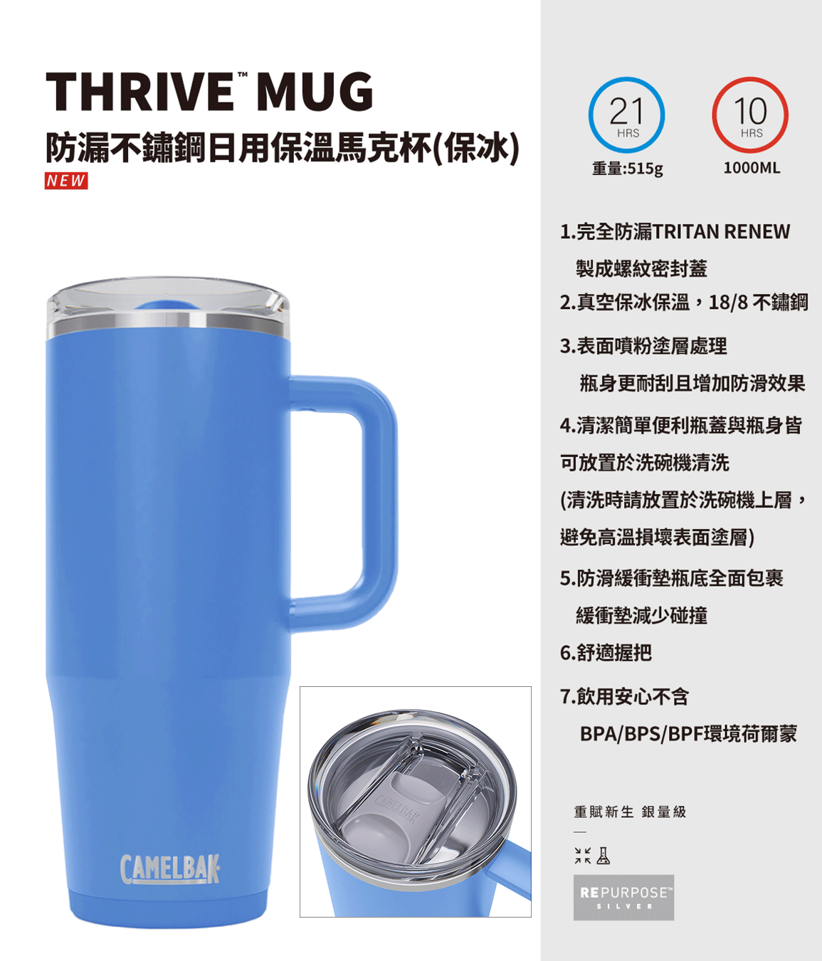 • 完全防漏TRITAN RENEW製成,螺紋密封蓋