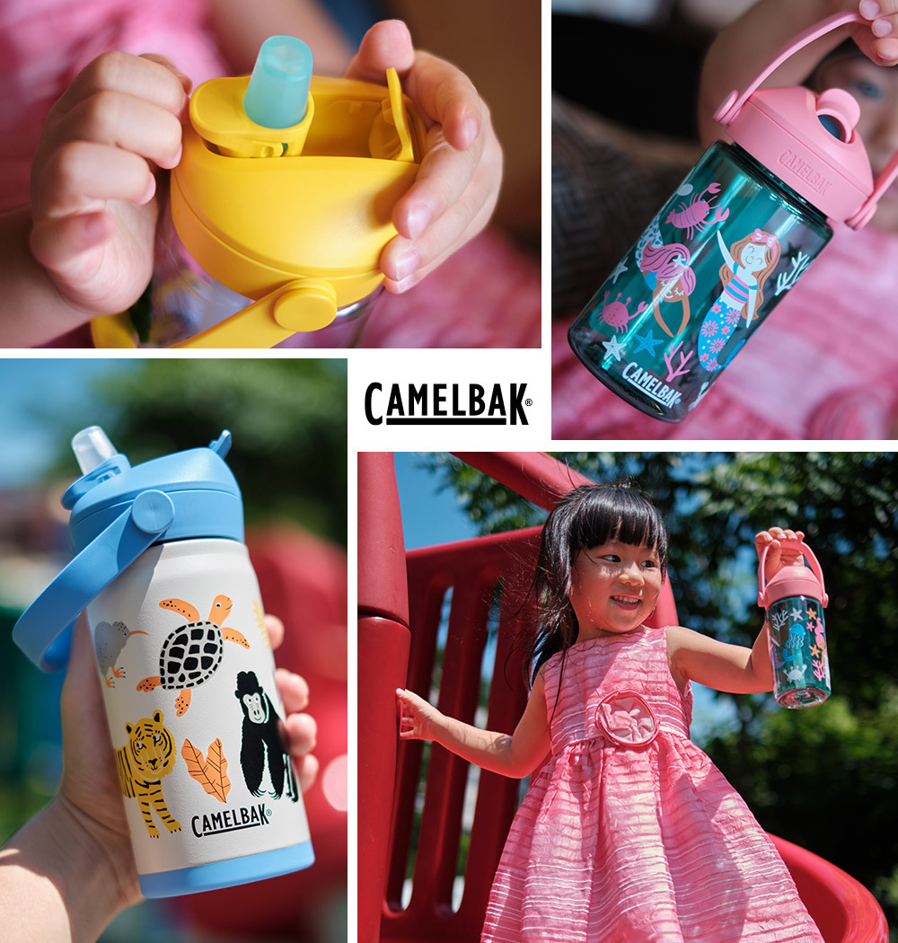 CamelBak 新推出Flip Straw 兒童吸管運動水瓶,每季推出不同設計圖案及配色,讓大小朋友都愛不釋手。全系列水瓶保證不含環境賀爾蒙 BPA「雙酚A」,並符合歐盟食品容器規範及兒童用容器標準、並符合美國 FDA 認證為安全容器。針對兒童設計的特殊咬嘴,不會因孩童的啃咬而脫落,咬嘴為醫療級矽膠製作,可自動閉合,小朋友的口水不會回流到水瓶中。使用起來安心、安全無負擔!