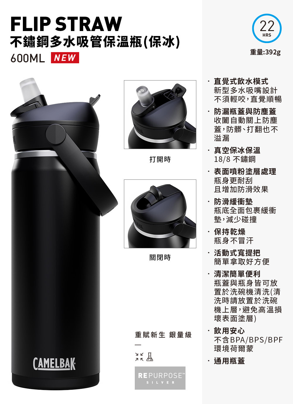 CamelBak 600ml Flip Straw不鏽鋼多水吸管保溫瓶(保冰)