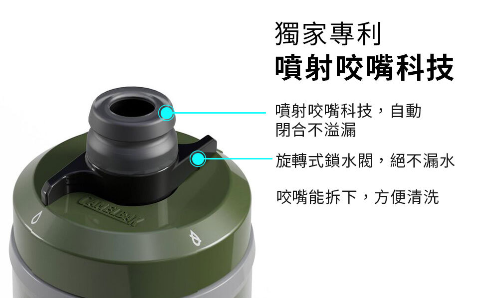 專為跑步或單車等高強度運動設計,讓運動員可以在不需停止的狀況下持續補水。獨家專利" 噴射咬嘴閥",擠壓瓶身即可直接飲水,免去雙手開蓋或用牙齒咬開吸嘴的麻煩,讓您可以享受一邊運動一邊補水的快感。