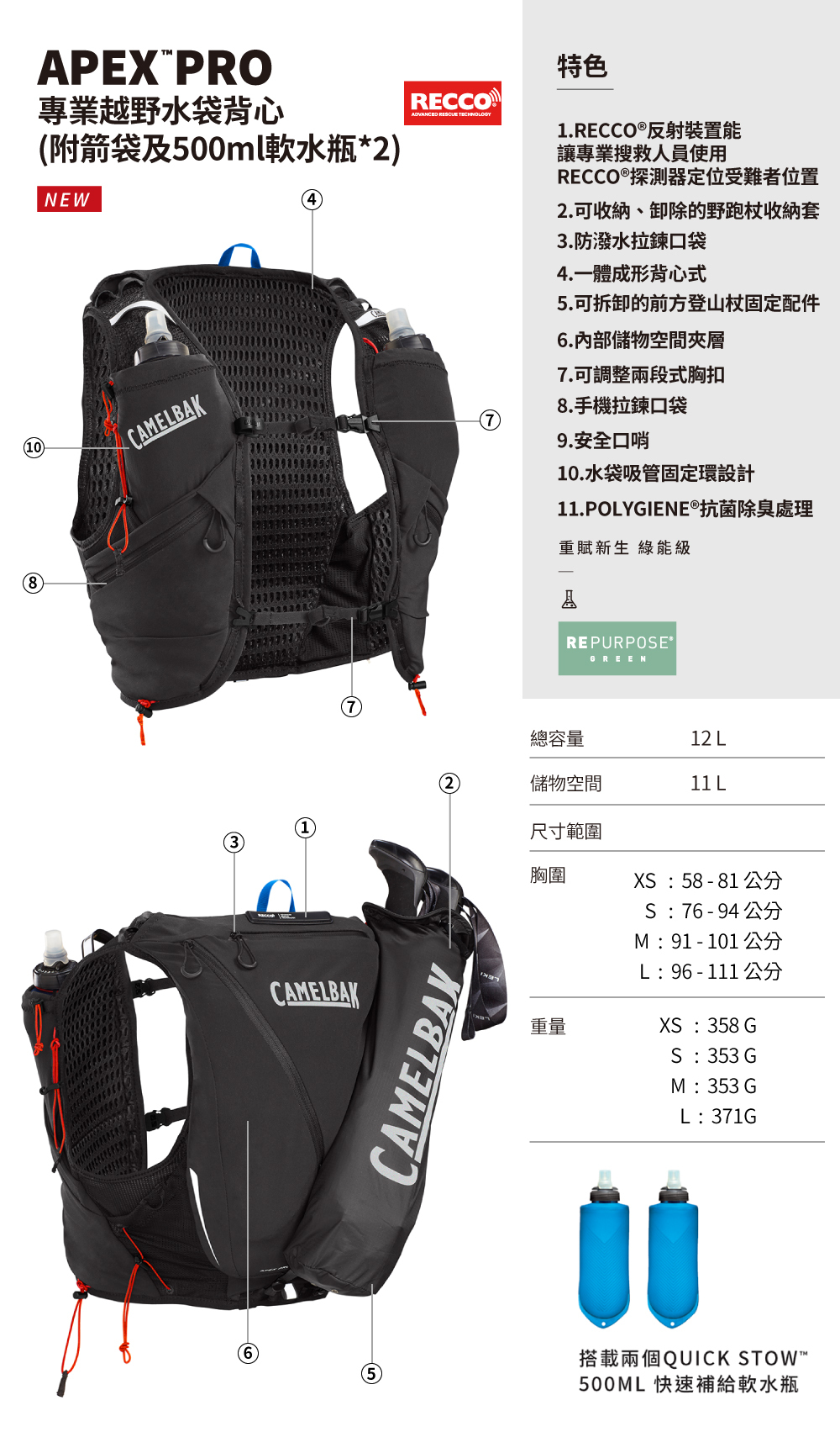 APEX ™ PRO 12越野水袋背心 專業極限越野水袋背心(附箭袋及500ml軟水瓶*2)