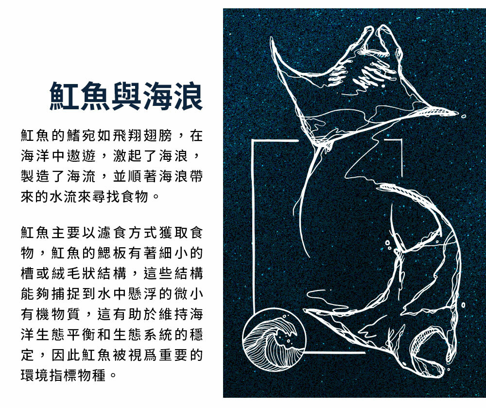 魟魚與海浪-魟魚的鰭宛如飛翔翅膀,在海洋中遨遊,激起了海浪,製造了海流,並順著海浪帶來的水流來尋找食物。魟魚主要以濾食方式獲取食物,魟魚的鰓板有著細小的槽或絨毛狀結構,這些結構能夠捕捉到水中懸浮的微小有機物質,這有助於維持海洋生態平衡和生態系統的穩定,因此魟魚被視爲重要的環境指標物種。