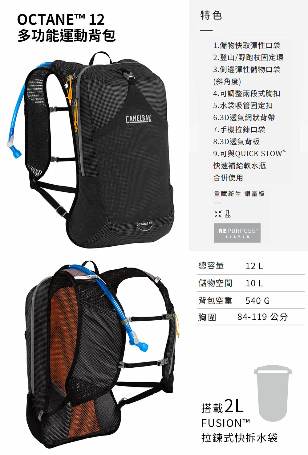 CamelBak Octane 12 Cordura多功能運動背包(附2L拉鍊式快拆水袋)黑