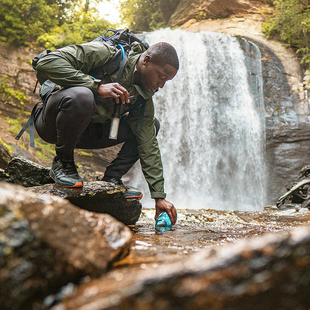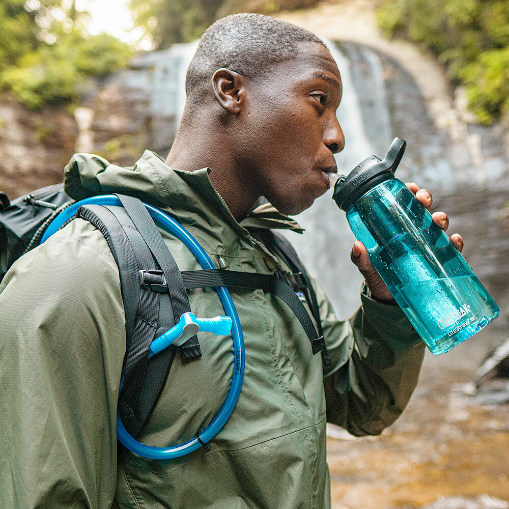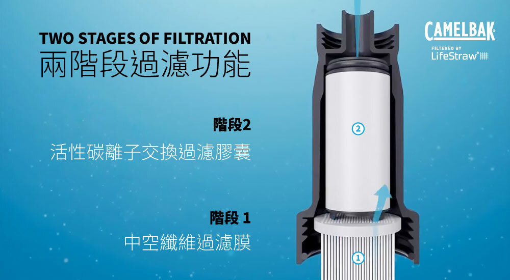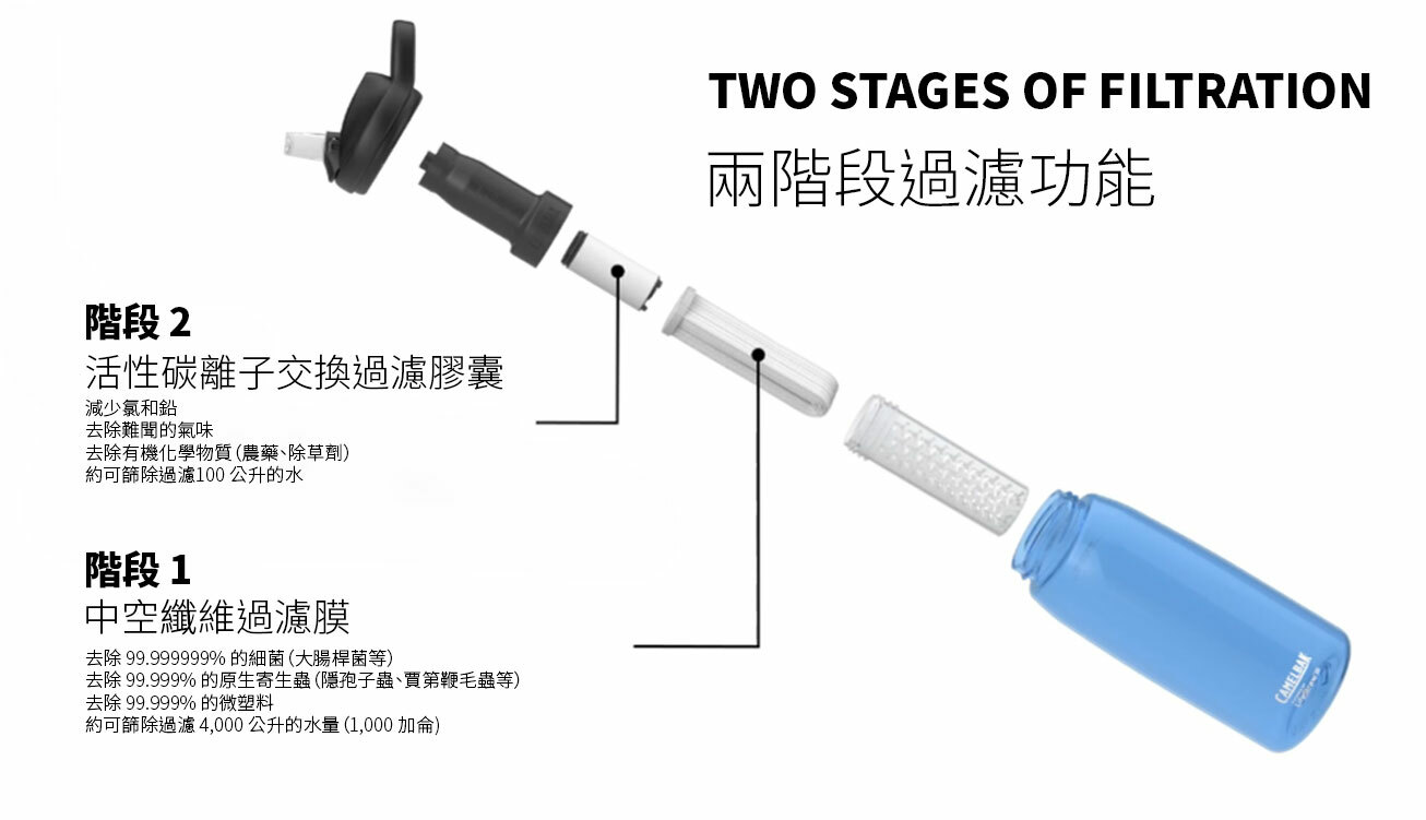 LIFESTRAW 濾心水瓶,使用LIFESTRAW® 專利設計的過濾系統,讓水通過兩個 完整過濾階段:中空纖維過濾膜可去除細菌、寄生蟲、和微塑料;活性碳離子交 換過濾膠囊可減少難聞的氣味和氯。